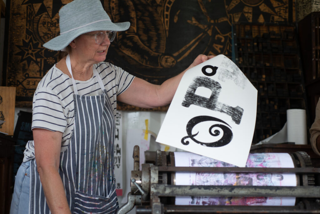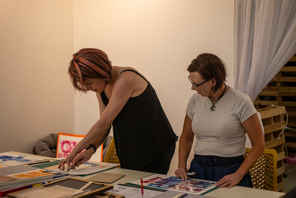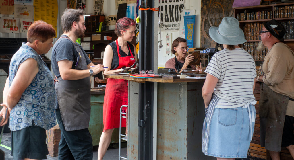 Clint led the foundational session on letterpress: understanding points and picas, the differences between wood and lead type, lock-ups, composition, and the realities of setting type by hand. Meanwhile, Barnaby Florence and Dzintra Menesis kept the presses running so participants could focus on making work rather than waiting for ink to dry.