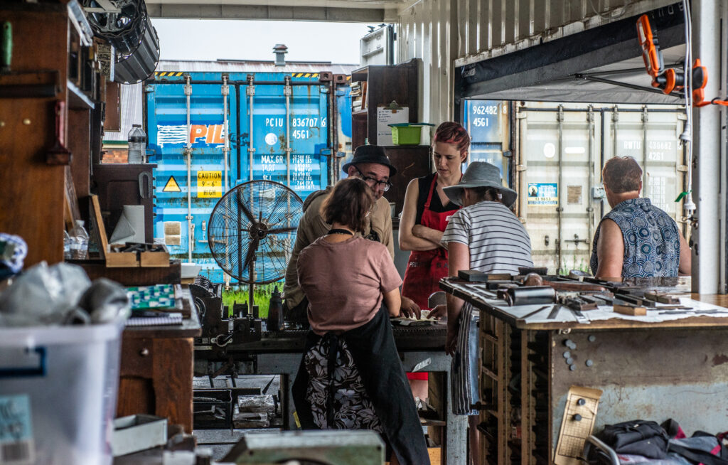 Saturday was hosted within the Moveable Type shipping-container studio at the Paint Factory. Despite the heat, our participants arrived ready to learn, experiment, and persevere.